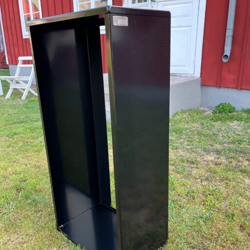 Bokhylla är tillverkad i armeringsjärn och stålplåt.