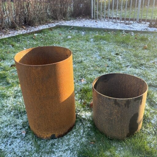 Våra produkter i cortén levereras nytillverkade i sin ursprungliga mörkgrå stålfärg.